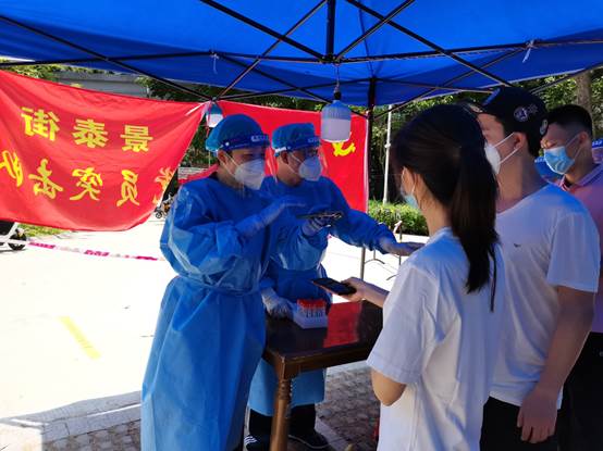 張湘軍夫婦在景泰街大金鐘社區(qū)核酸檢測現(xiàn)場工作
